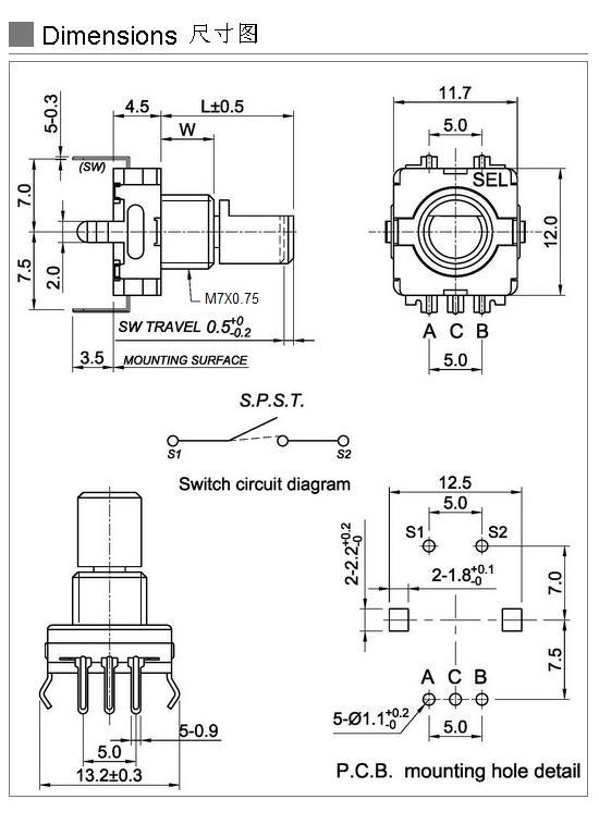 长寿命,密封性好,电性性能稳定,体积小,可带按压开关 功率:5V DC 5mA 接触阻抗:10 max 绝缘阻抗:50V DC- 10M min 耐电压:50V AC 1 minute 扭矩:30-200gf.cm 寿命:30000 cycles min...