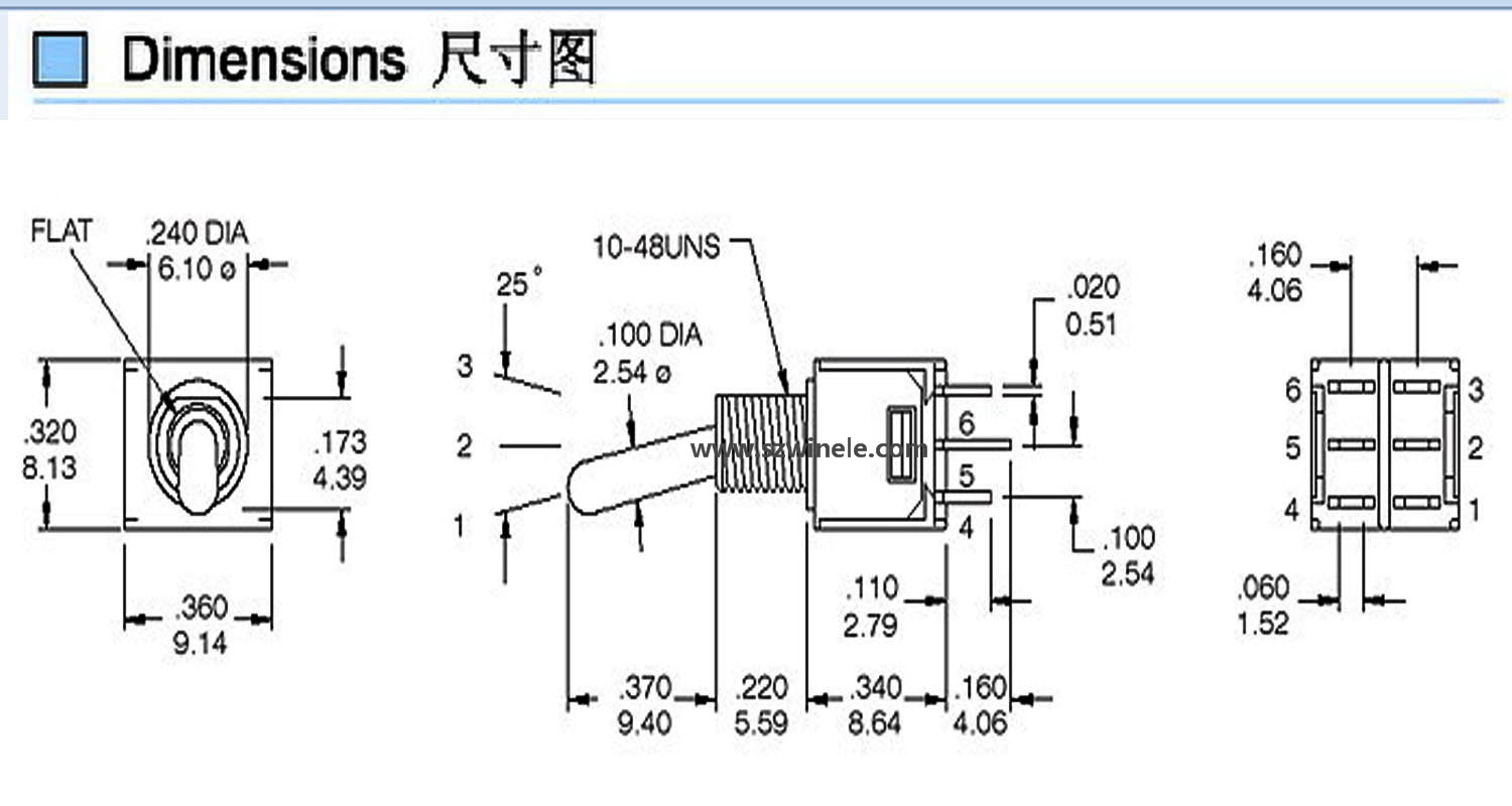 额定值:250VAC / 2A 125V / 5A 介电强度:1500VAC 50HZ 绝缘电阻:100M 接触电阻:0.02 寿命:10000次以上 主体材料:ABS 手柄:镀镍铜 端子:铜镀银或金色 开关功能...