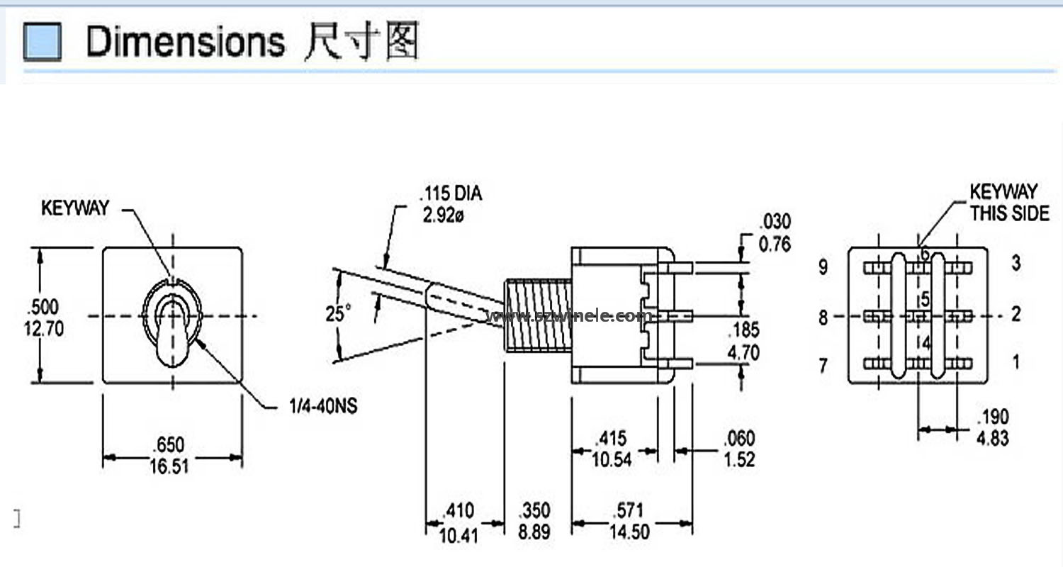 额定值:250VAC / 2A 125V / 5A 介电强度:1500VAC 50HZ 绝缘电阻:100M 接触电阻:0.02 寿命:10000次以上 主体材料:ABS 手柄:镀镍铜 端子:铜镀银或金色 开关功能...