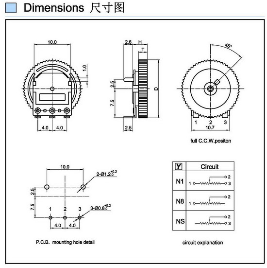 Rotary Potentiometer Rating:0.05W Contact Resistance:50m max InsulationResistance:500V DC- 100K min Withstand Voltage:500V AC 1 minute Operating Force:20-200gf.cm Life Cycle:15000 cycles min...