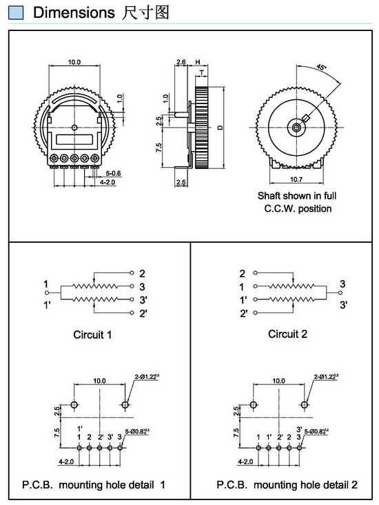 Rotary Potentiometer Rating:0.05W Contact Resistance:50m max InsulationResistance:500V DC- 100K min Withstand Voltage:500V AC 1 minute Operating Force:20-200gf.cm Life Cycle:15000 cycles min...