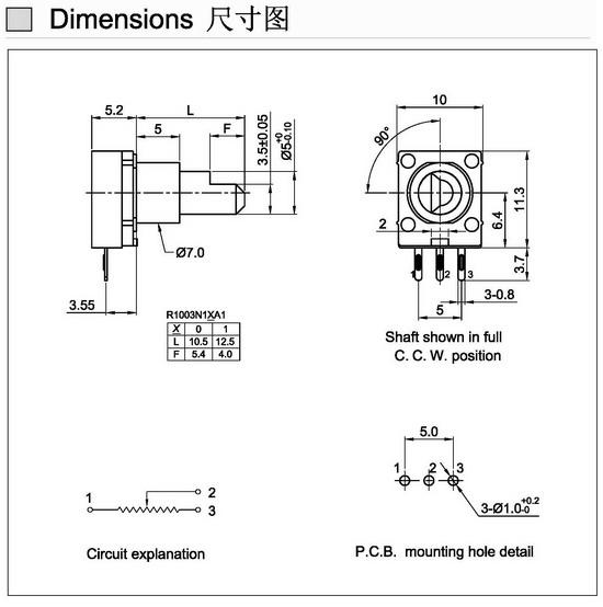 Rotary Potentiometer Rating:0.05W Contact Resistance:50m max InsulationResistance:500V DC- 100K min Withstand Voltage:500V AC 1 minute Operating Force:20-200gf.cm Life Cycle:15000 cycles min...