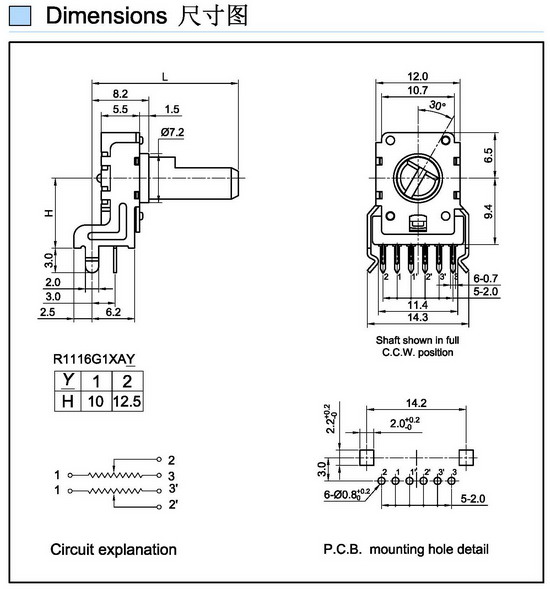 Rotary Potentiometer Rating:0.05W Contact Resistance:50m max InsulationResistance:500V DC- 100K min Withstand Voltage:500V AC 1 minute Operating Force:20-200gf.cm Life Cycle:15000 cycles min...