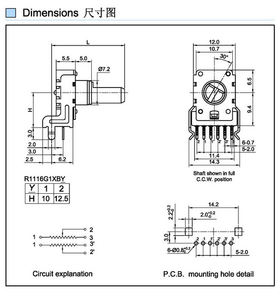 Rotary Potentiometer Rating:0.05W Contact Resistance:50m max InsulationResistance:500V DC- 100K min Withstand Voltage:500V AC 1 minute Operating Force:20-200gf.cm Life Cycle:15000 cycles min...