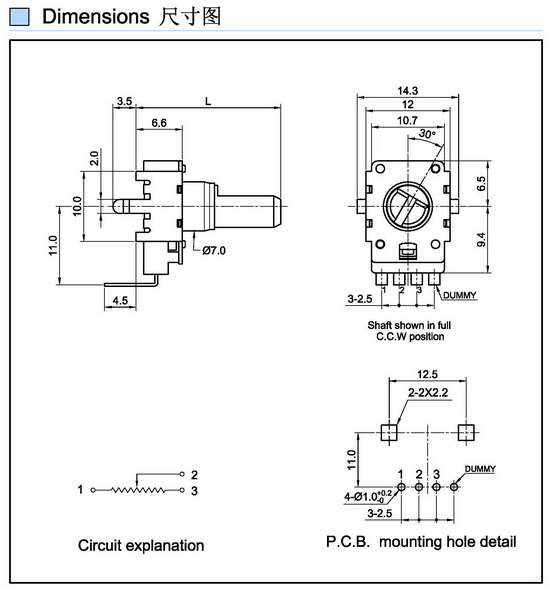 Rotary Potentiometer Rating:0.05W Contact Resistance:50m max Insulation Resistance:250V DC- 100K min Withstand Voltage:250V AC 1 minute Operating Force:10-100gf.cm Life Cycle:10000 cycles min Rating:0.05W Contact Resistance:5...