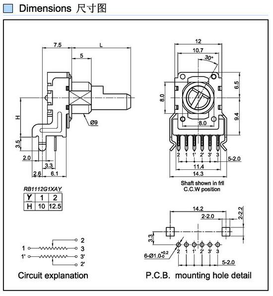 Rotary Potentiometer Rating:0.05W Contact Resistance:50m max Insulation Resistance:250V DC- 100K min Withstand Voltage:250V AC 1 minute Operating Force:10-100gf.cm Life Cycle:10000 cycles min...