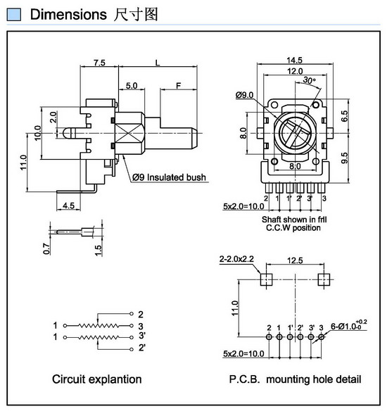 Rotary Potentiometer Rating:0.05W Contact Resistance:50m max Insulation Resistance:250V DC- 100K min Withstand Voltage:250V AC 1 minute Operating Force:10-100gf.cm Life Cycle:10000 cycles min...