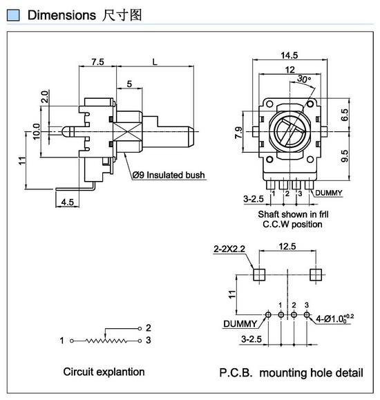 Rotary Potentiometer Rating:0.05W Contact Resistance:50m max Insulation Resistance:250V DC- 100K min Withstand Voltage:250V AC 1 minute Operating Force:10-100gf.cm Life Cycle:10000 cycles min...