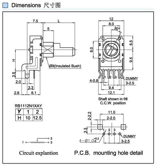 Rotary Potentiometer Rating:0.05W Contact Resistance:50m max Insulation Resistance:250V DC- 100K min Withstand Voltage:250V AC 1 minute Operating Force:10-100gf.cm Life Cycle:10000 cycles min...