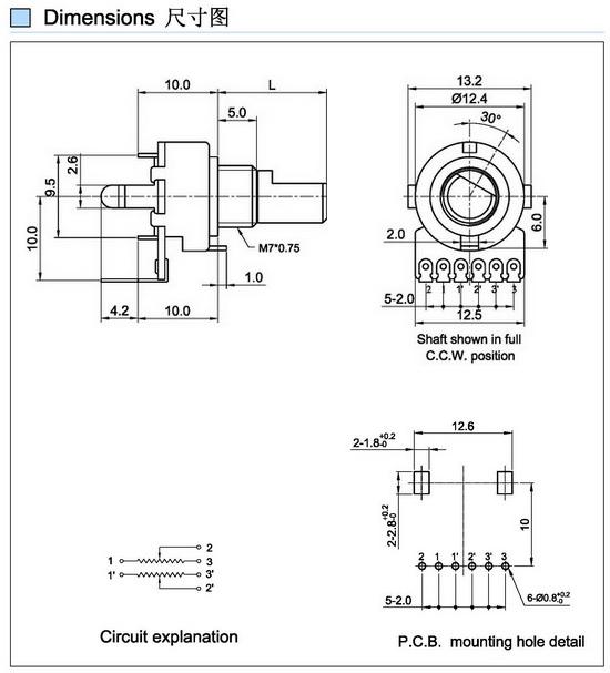 Rotary Potentiometer Rating:0.05W Contact Resistance:50m max Insulation Resistance:250V DC- 100K min Withstand Voltage:250V AC 1 minute Operating Force:10-100gf.cm Life Cycle:10000 cycles min...