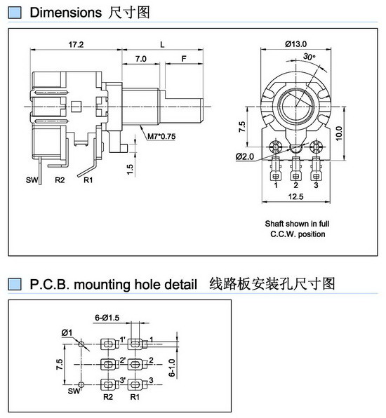 12mm Rotary potentiometer with rotary switch Rating:0.03W Contact Resistance:50m max Insulation Resistance:250V DC- 100K min Withstand Voltage:250V AC 1 minute Operating Force:10-100gf.cm Life Cycle:10000 cycles min...