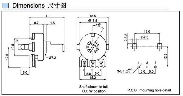 Rotary Potentiometer Rating:0.05W Contact Resistance:50m max InsulationResistance:500V DC- 100K min Withstand Voltage:500V AC 1 minute Operating Force:20-200gf.cm Life Cycle:15000 cycles min...
