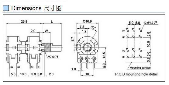 Rotary Potentiometer Rating:0.05W Contact Resistance:50m max InsulationResistance:500V DC- 100K min Withstand Voltage:500V AC 1 minute Operating Force:20-200gf.cm Life Cycle:15000 cycles min...