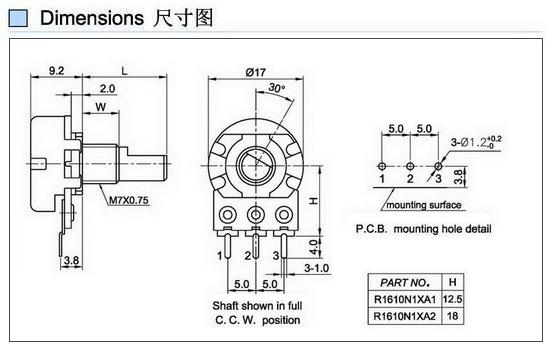 Rotary Potentiometer Rating:0.05W Contact Resistance:50m max InsulationResistance:500V DC- 100K min Withstand Voltage:500V AC 1 minute Operating Force:20-200gf.cm Life Cycle:15000 cycles min...