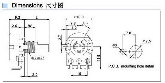 Rotary Potentiometer Rating:0.05W Contact Resistance:50m max InsulationResistance:500V DC- 100K min Withstand Voltage:500V AC 1 minute Operating Force:20-200gf.cm Life Cycle:15000 cycles min...