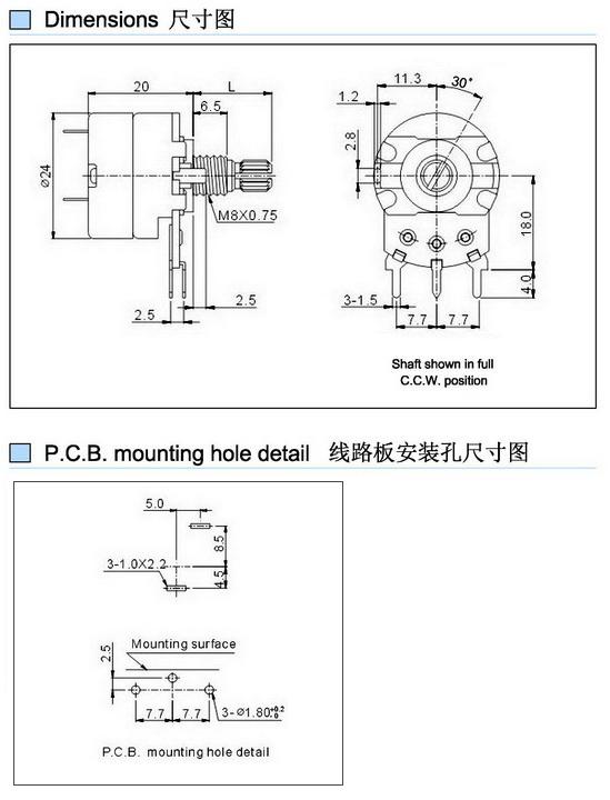 24mm potentiometer with switch Rating:1 W Contact Resistance:50m max InsulationResistance:500V DC- 100K min Withstand Voltage:500V AC 1 minute Operating Force:20-200gf.cm Life Cycle:15000 cycles min...