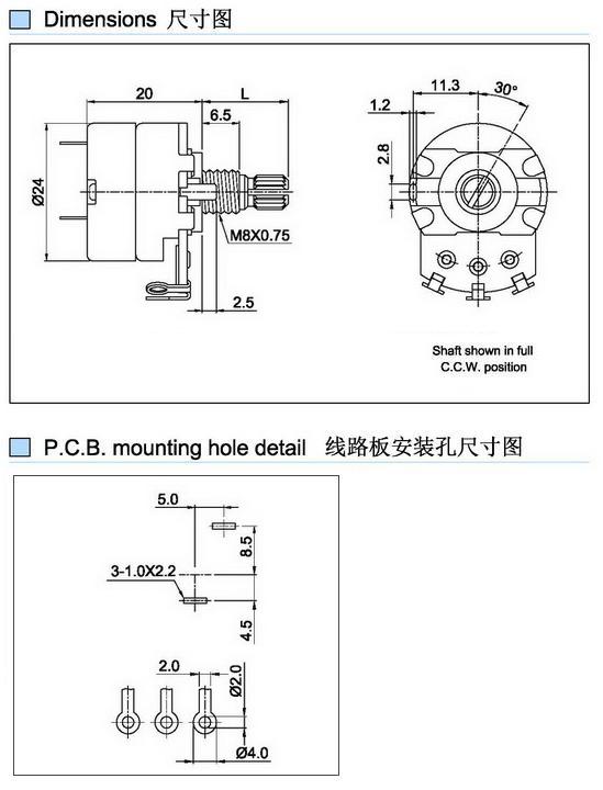 24mm potentiometer with rotary switch 0 Rating:1 W Contact Resistance:50m max InsulationResistance:500V DC- 100K min Withstand Voltage:500V AC 1 minute Operating Force:20-200gf.cm Life Cycle:15000 cycles min...