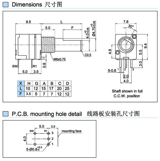 Switch Potentiometer Rating:0.05W Contact Resistance:50m max InsulationResistance:500V DC- 100K min Withstand Voltage:500V AC 1 minute Operating Force:20-200gf.cm Life Cycle:15000 cycles min...