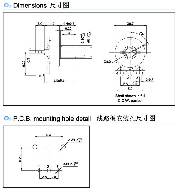 Rotary Potentiometer Rating:0.05W Contact Resistance:50m max InsulationResistance:500V DC- 100K min Withstand Voltage:500V AC 1 minute Operating Force:20-200gf.cm Life Cycle:15000 cycles min...